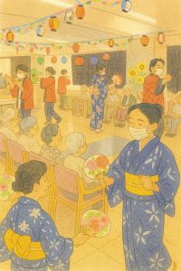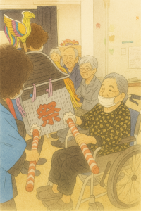 上條記念病院の通所介護も夏祭りだ~!わっしょい! 2025.09.30 上條記念病院の5階フロアの通所介護でも夏祭りを行いました~!! 通所介護では、夏祭りのイベントとして御神輿や盆踊り、輪投げを実施しました!! わっしょい!わっしょい! 色鮮やかな法被や浴衣で雰囲気を盛り上げ、皆さん童心に返ったように楽しんでおられました(*^^*) 御神輿を担ぐ掛け声や、盆踊りの音頭が響き渡り、夏らしい活気に包まれた時間となりました~!!